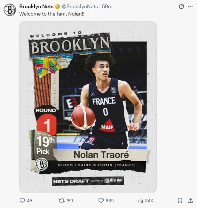 篮网用第19号签选了法国控卫诺兰-特拉奥雷,他身高1.91米,上赛季效力于圣坛康俱乐部,场均11.4分1.7篮板5.2助攻,投篮命中率39.2%,三分命中率30.4%实力其实挺一般。
