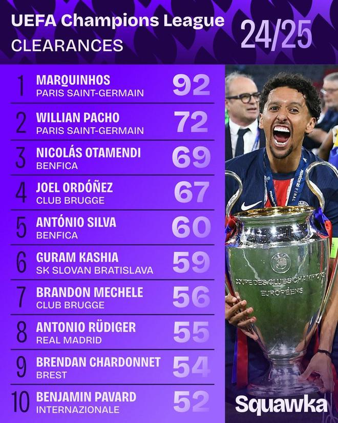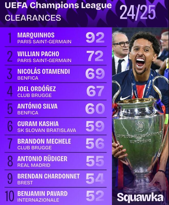 24/25赛季欧冠解围榜:马尔基尼奥斯92次断档领先,帕乔72次居次席